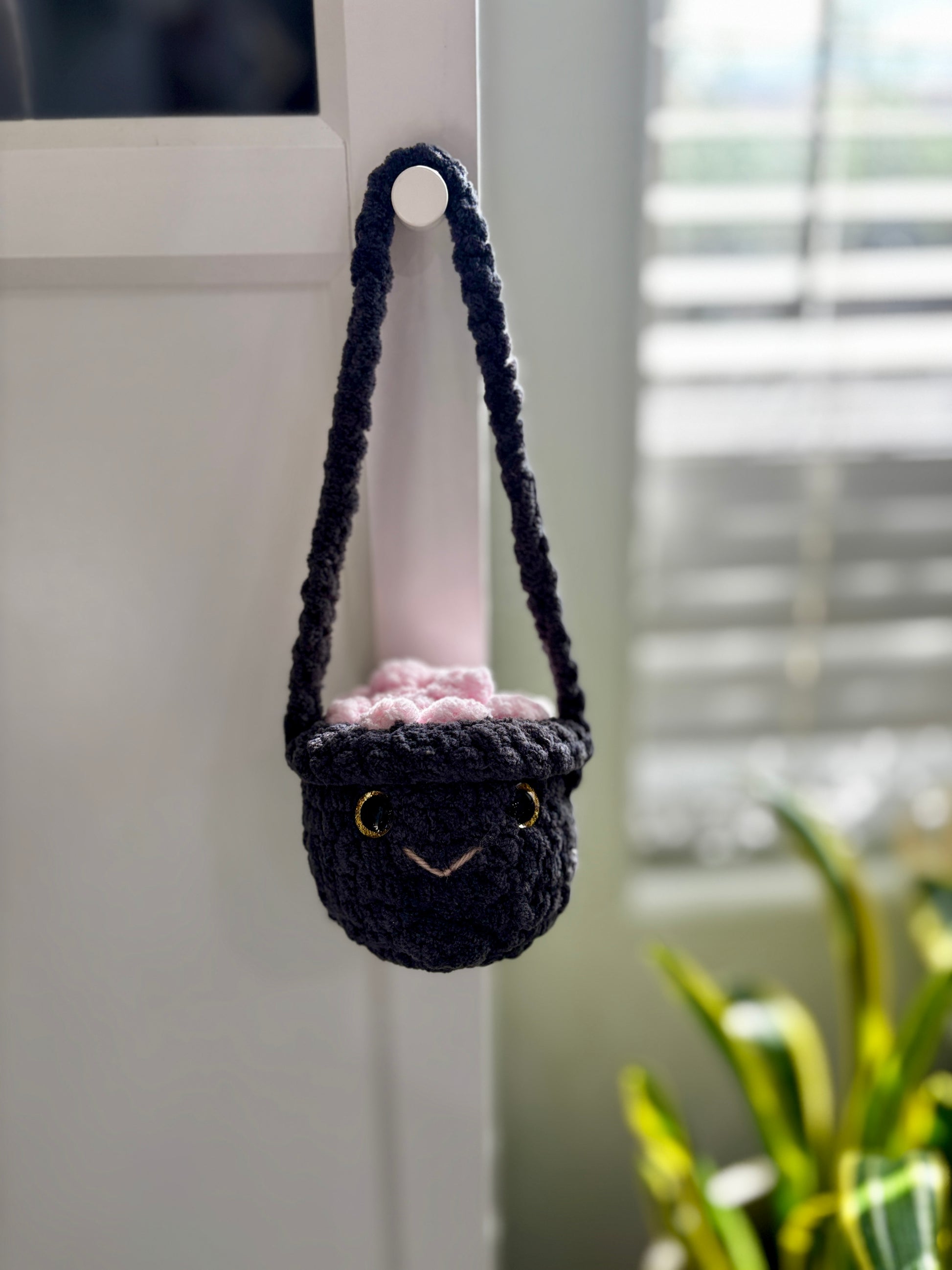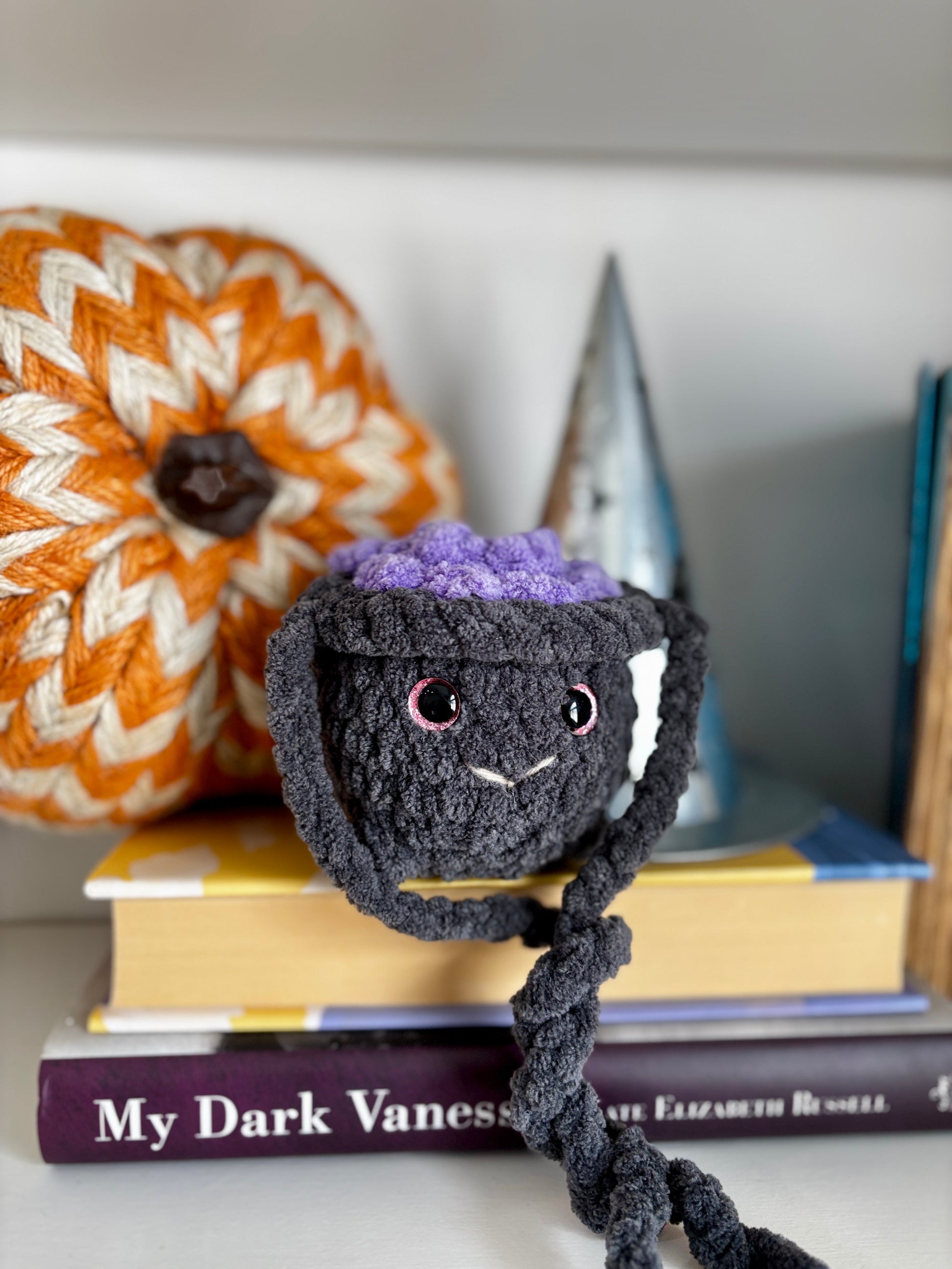 Each little cauldron is carefully crocheted by hand, featuring a soft black base and a bubbly "potion" too in one of four enchanting colors. Their sweet embroidered smiles and sparkly eyes make them the perfect mix of cute and spooky - ideal for Halloween season or year-round cozy decor!